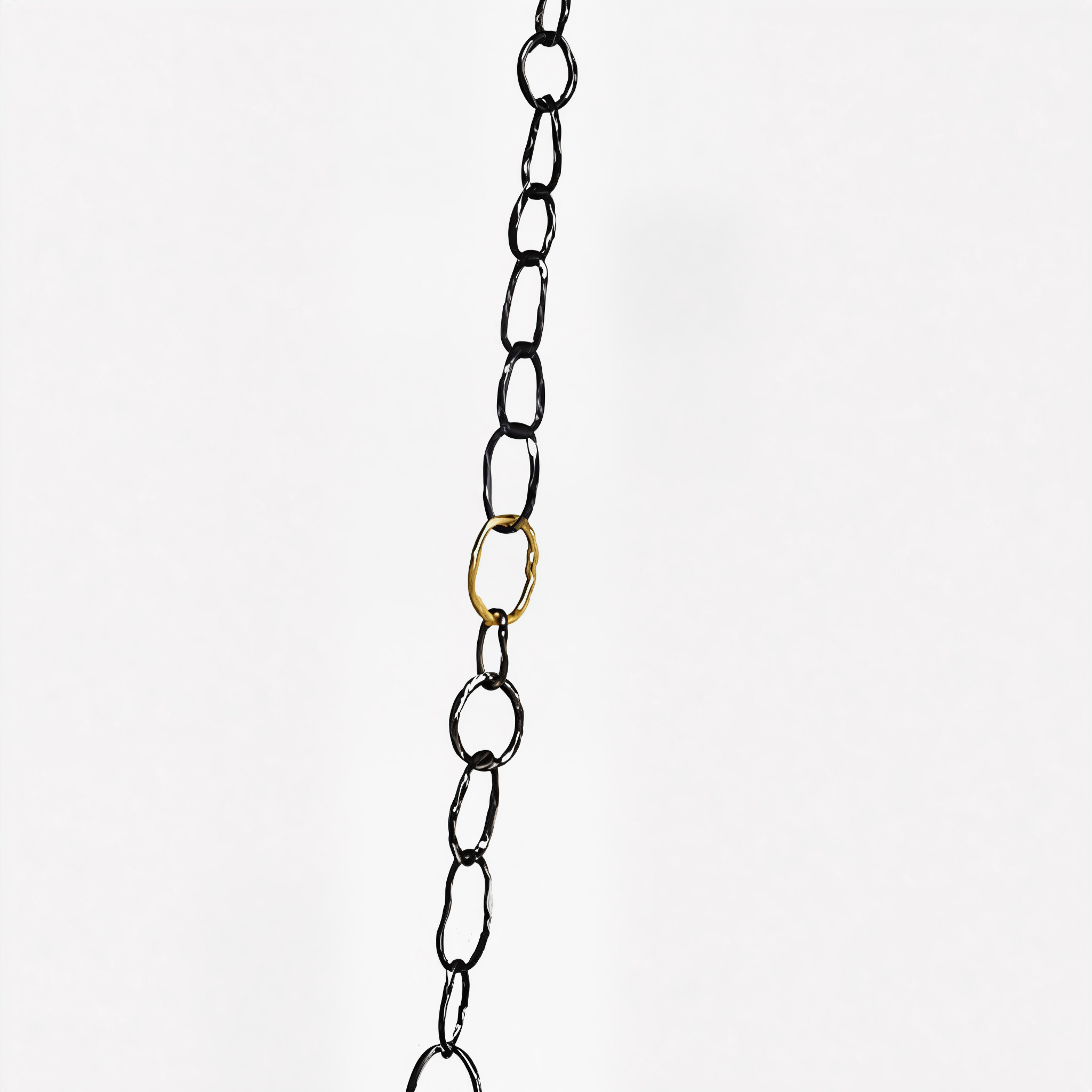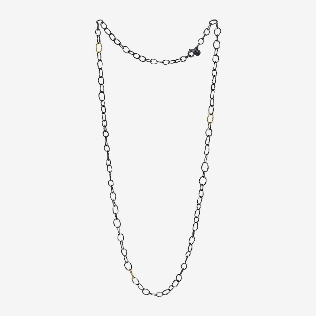 Exclusive handcrafted necklace in lightly oxidized 925 sterling silver with three links wrapped in a thin, fused layer of 18k gold. The solid gold coating provides a subtle shine and timeless luxury. The chain’s organic links add life and character, and the 100cm long chain is easily adjustable. Link sizes: 8.5–10.3mm.