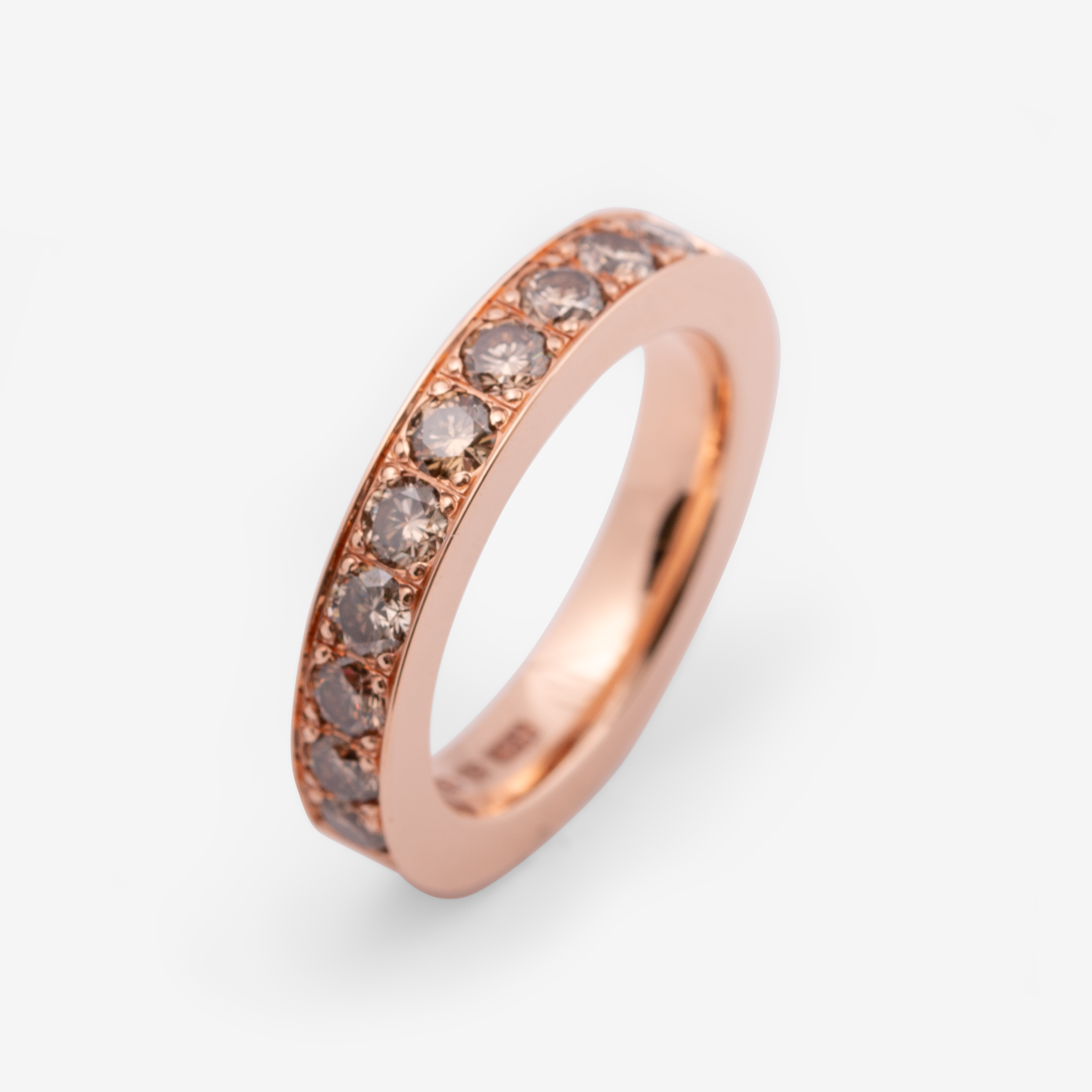 Handmade ring in recycled 18k rosegold with ten 0.10ct brilliant cut coffee diamonds.