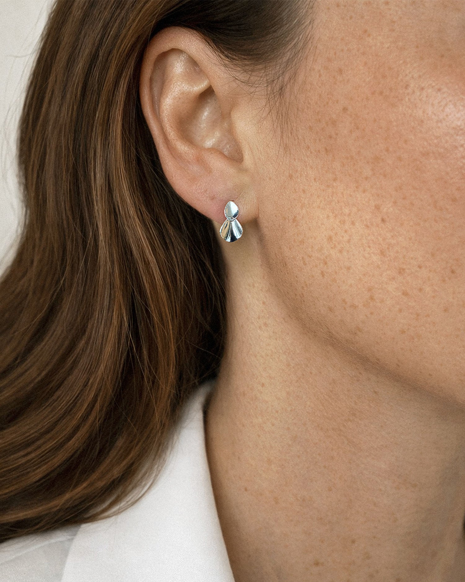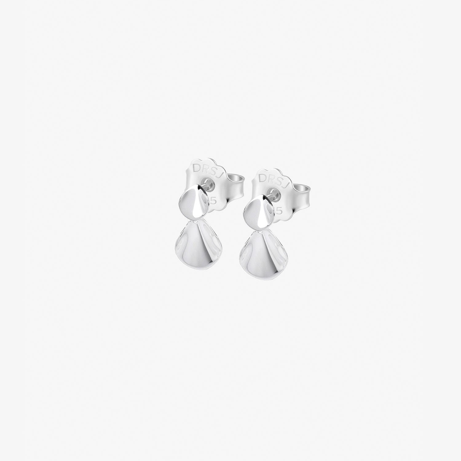 A pair of small silver earrings on stud. Feature two pendants, one smaller and one bigger overlapping each other in recycled 925 sterling silver.
