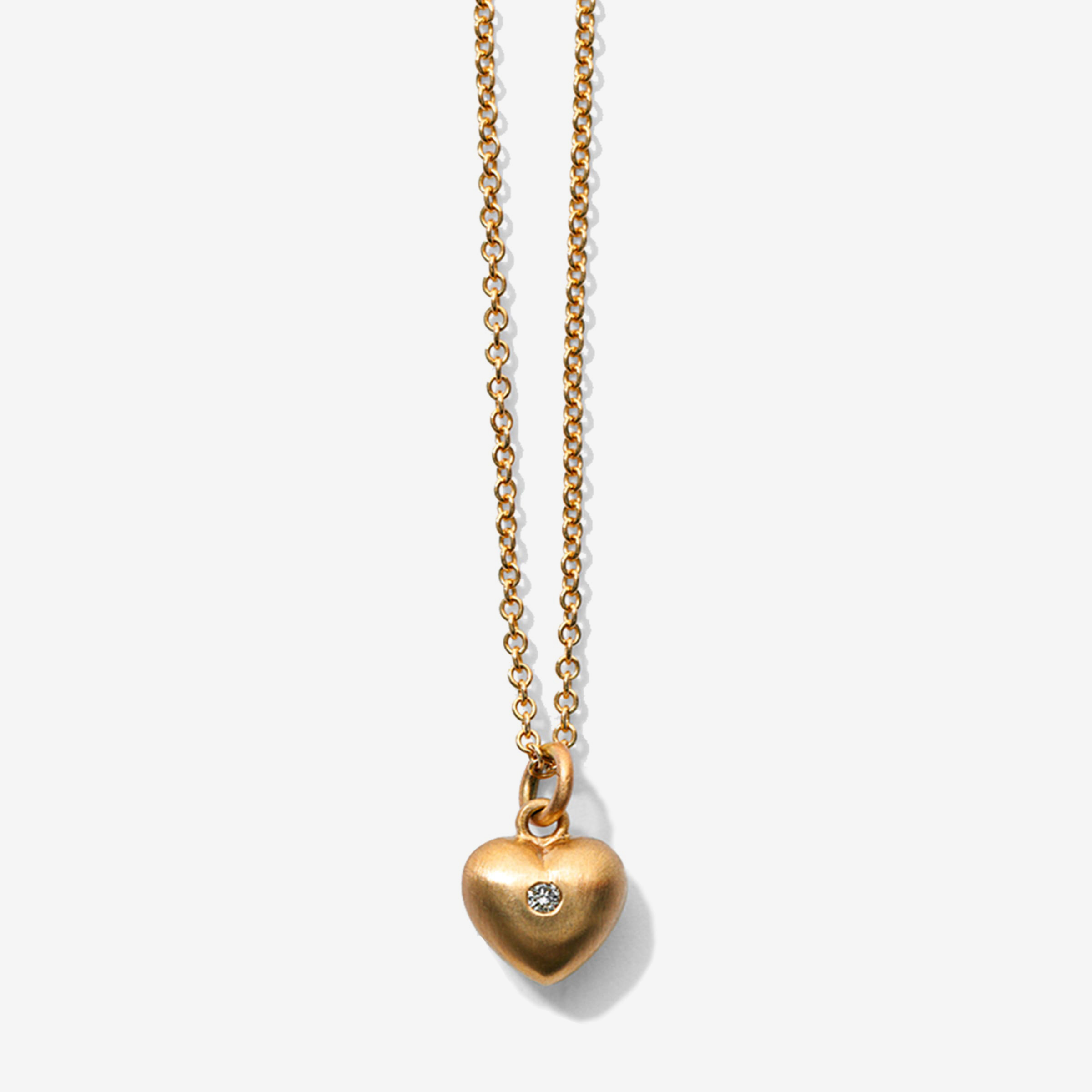 Necklace in 14k silk matte solid gold. set with 1x 0,02ct brilliant cut diamond TW/vs2. Length of necklace: 53 cm. Size of heart: 7 x 7 mm.