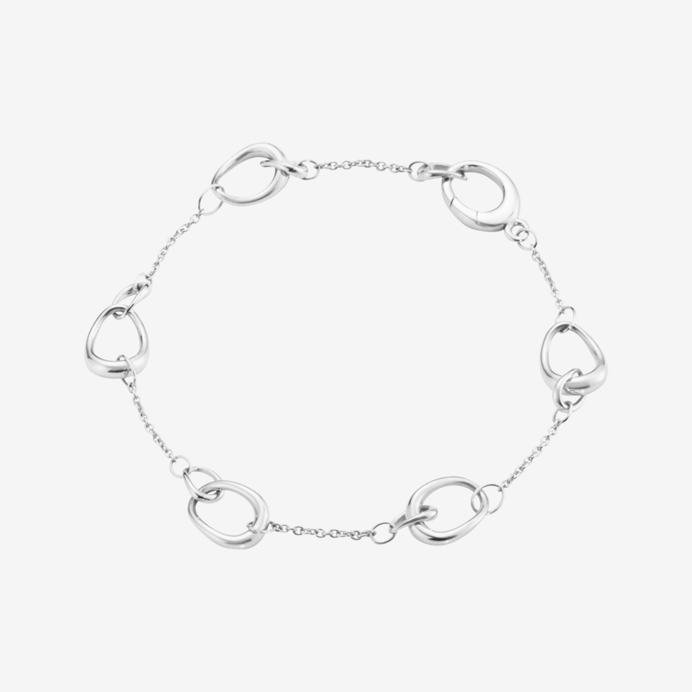 This bracelet in 925 Sterling silver is part of Jacqueline Rabun’s Offspring collection. The simplicity of the design comprises a string of larger silver loops interspersed with delicate chain links. Its form is imbued with profound symbolism; interlocking elements represent the strength of emotional bonds that bind together human relationships.