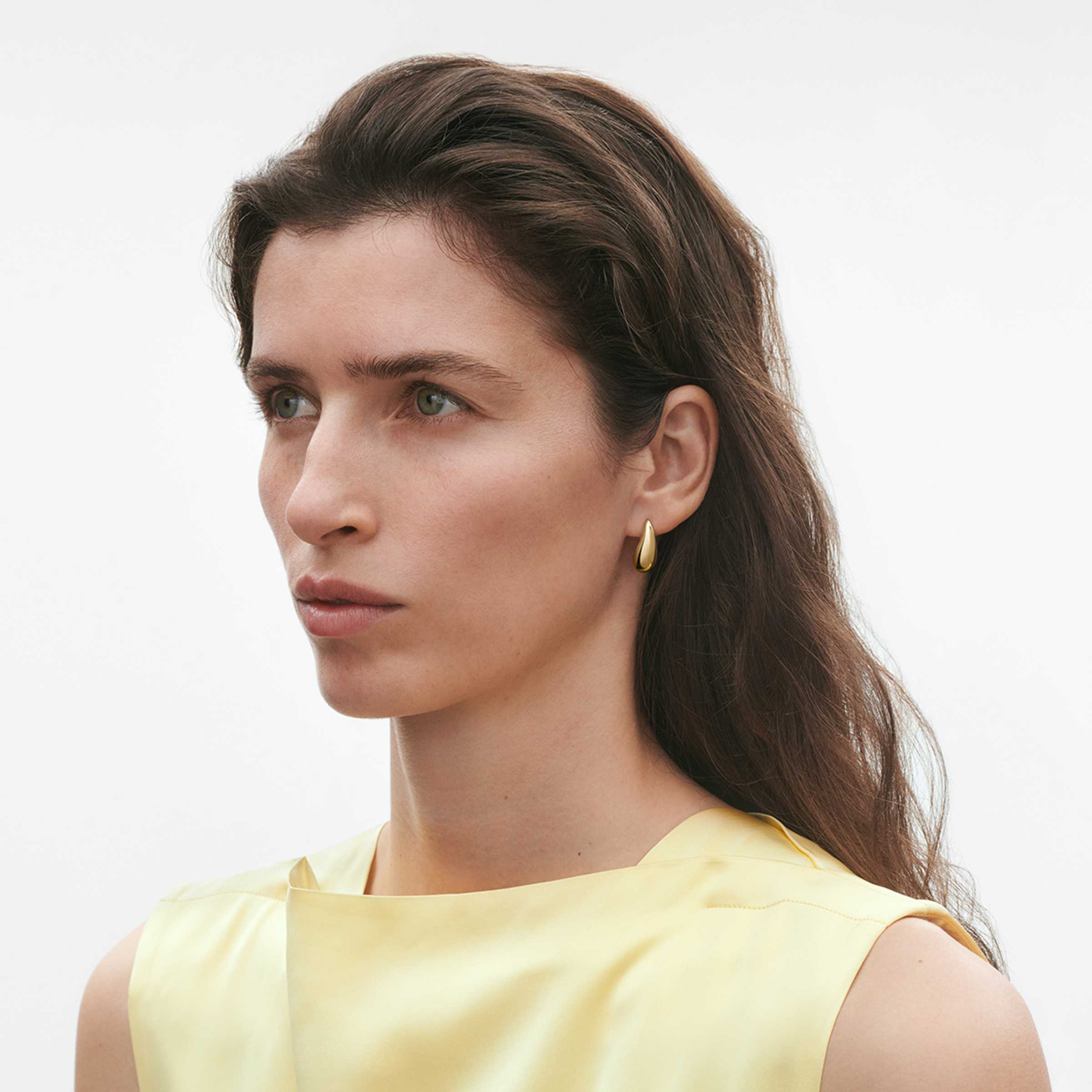 This sleek recycled 18k gold earrings showcases the distinctive design language of Jacqueline Rabun’s Reflect collection. With its bold, organic form, it introduces a touch of modern sophistication to any look, balancing sculptural elegance with a contemporary edge.