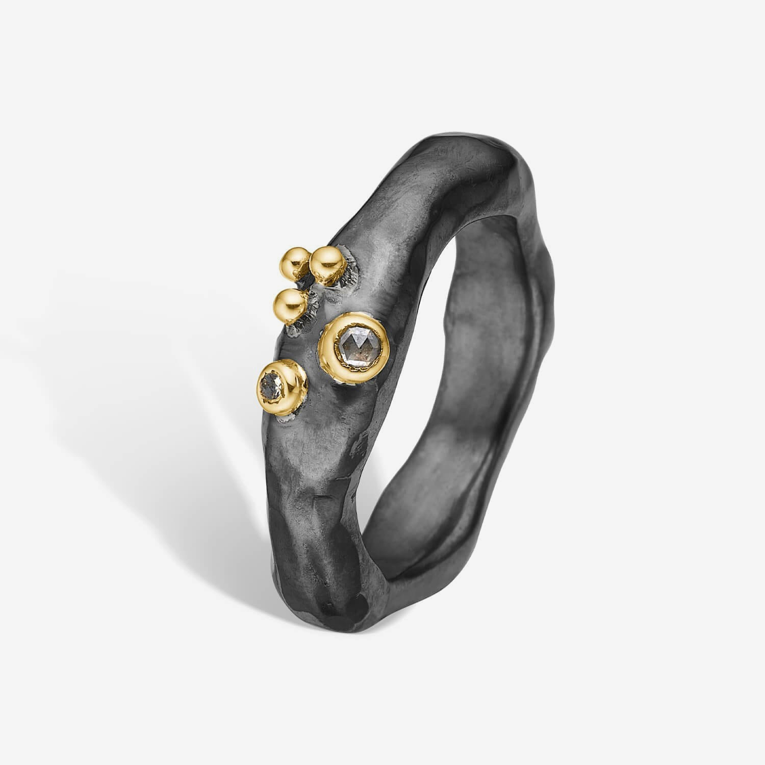 Hand forged ring in oxidized 925 Sterling silver with details in 14k gold and two diamonds.
