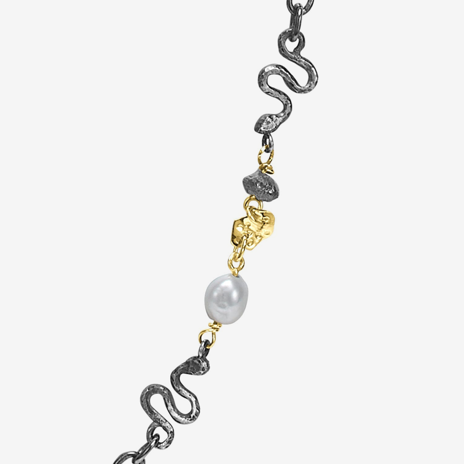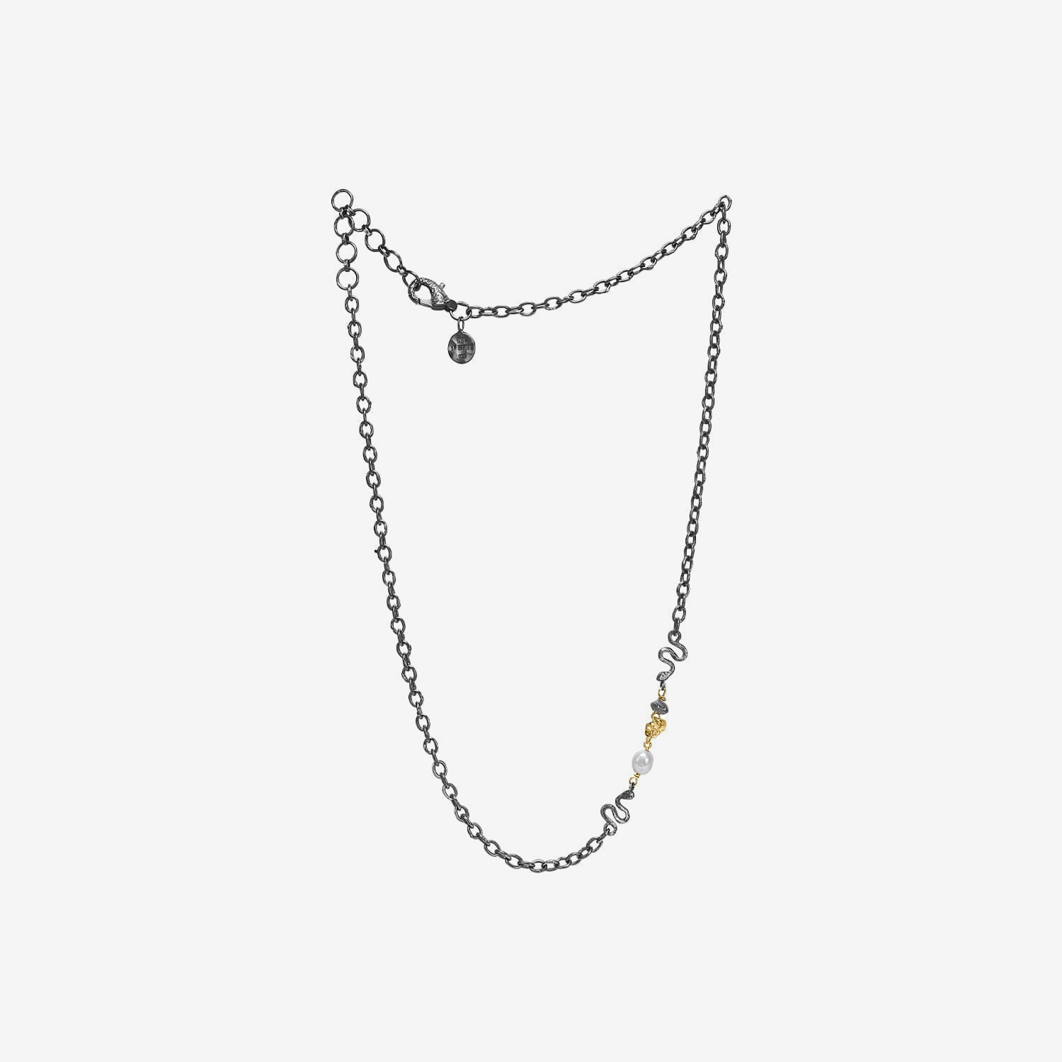 A unique necklace crafted in 14k gold and 925 Sterling silver, featuring an organically shaped keshi pearl and a raw diamond 0.55ct. Both elements are held by serpent-like links – a subtle yet powerful symbolic detail. The chain is adjustable from 45 to 50cm, making it easy to style for any occasion. A handcrafted piece where natural materials meet refined craftsmanship.
