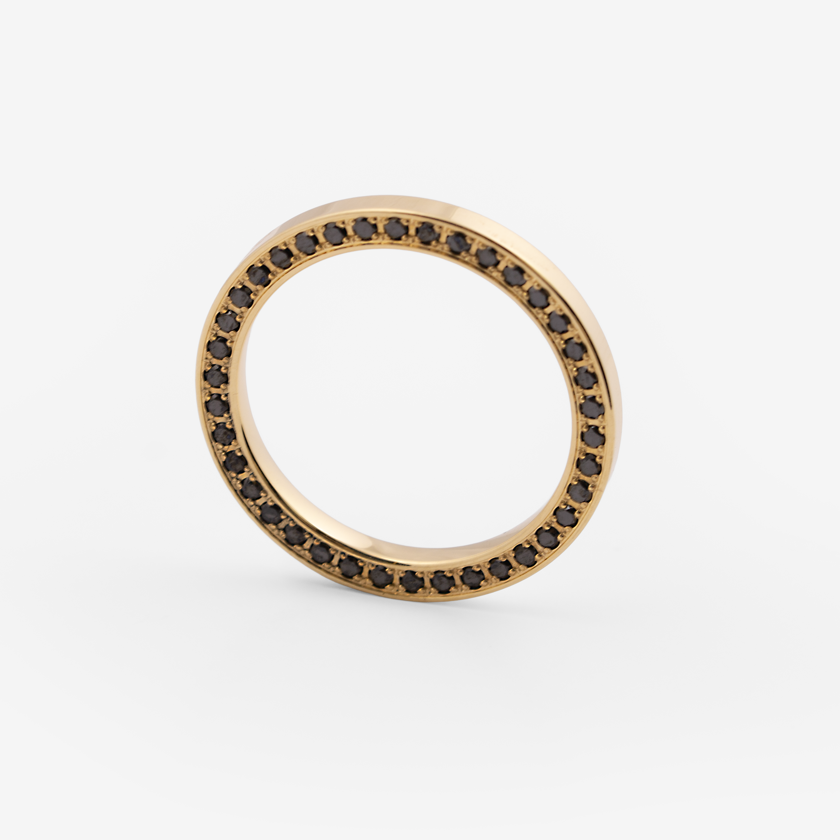Handmade ring in recycled 18k gold with thirty-eight 0.01ct brilliant cut black diamonds on the side. (Exact amount of stones vary depending on ring size)