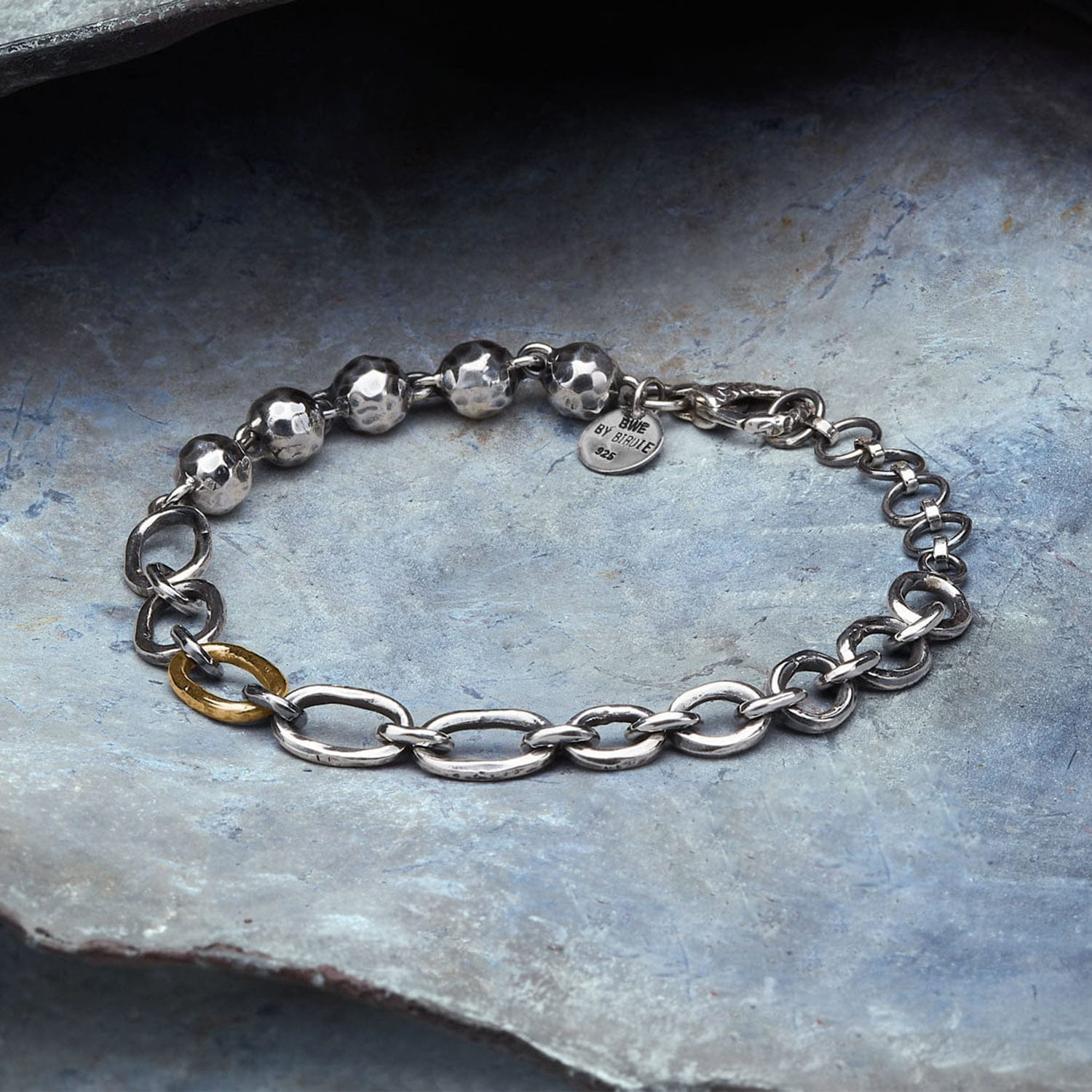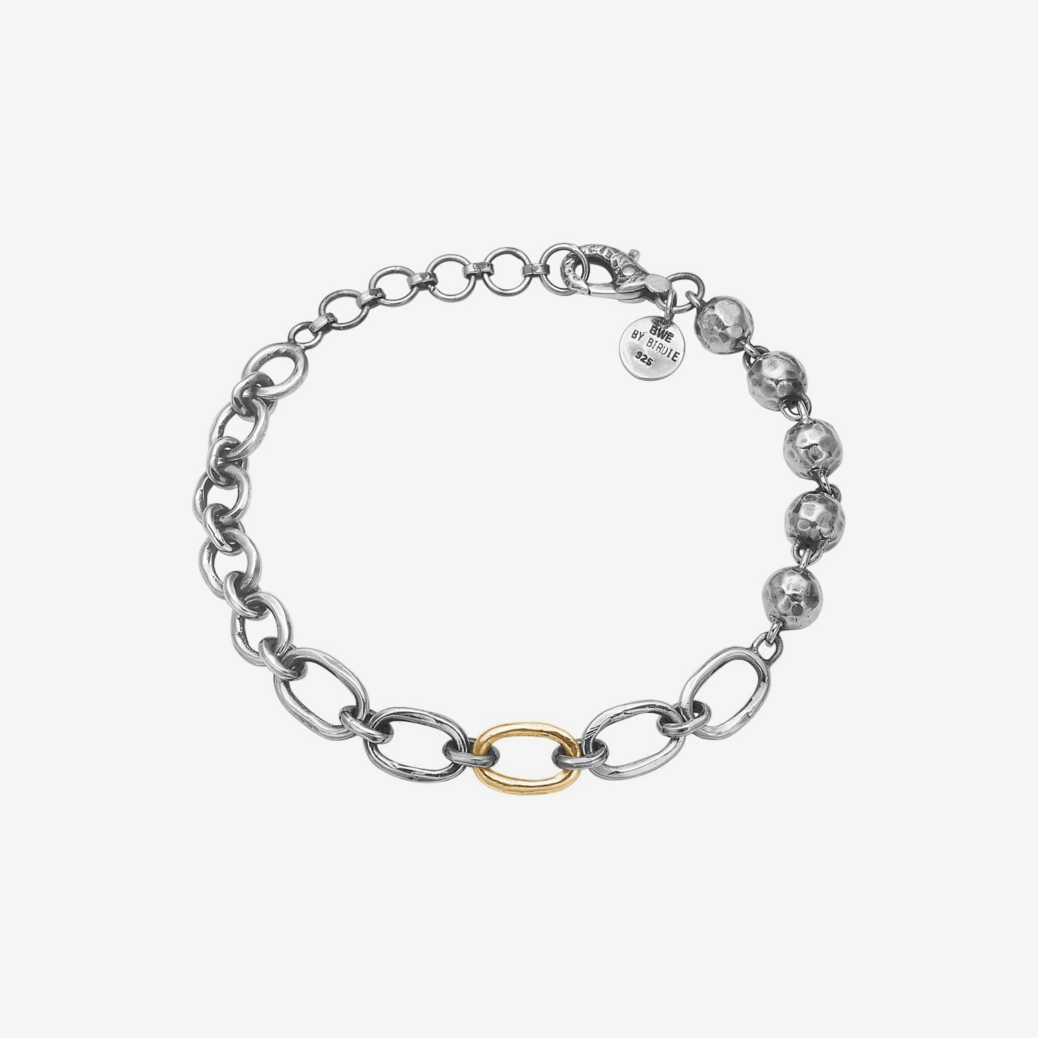 Handgjort armband sammansatt av silverlänkar och silverkulor med en hamrad yta som ger en rå och autentisk textur. En 18k guldlänk bryter av silvrets monokroma stil och skapar en balanspunkt för ögat.