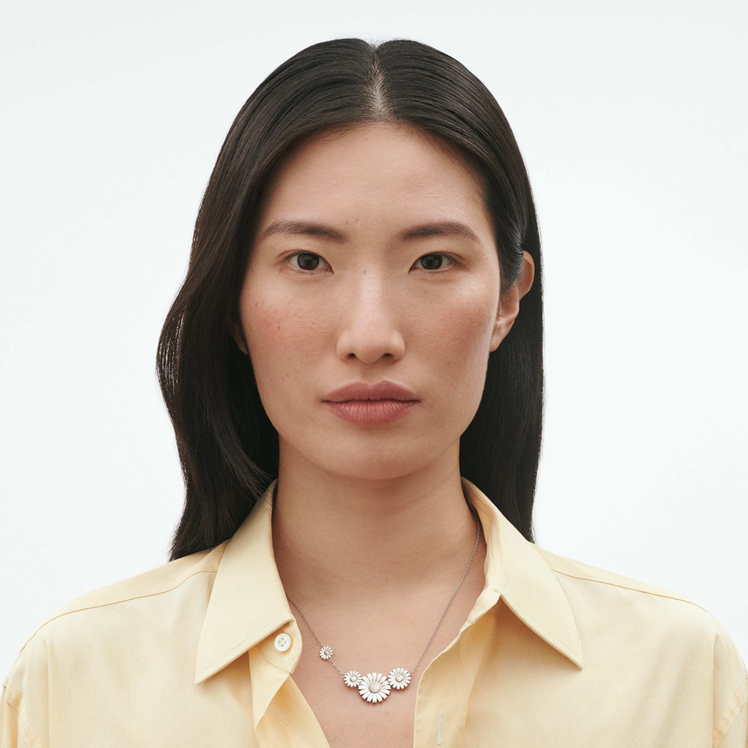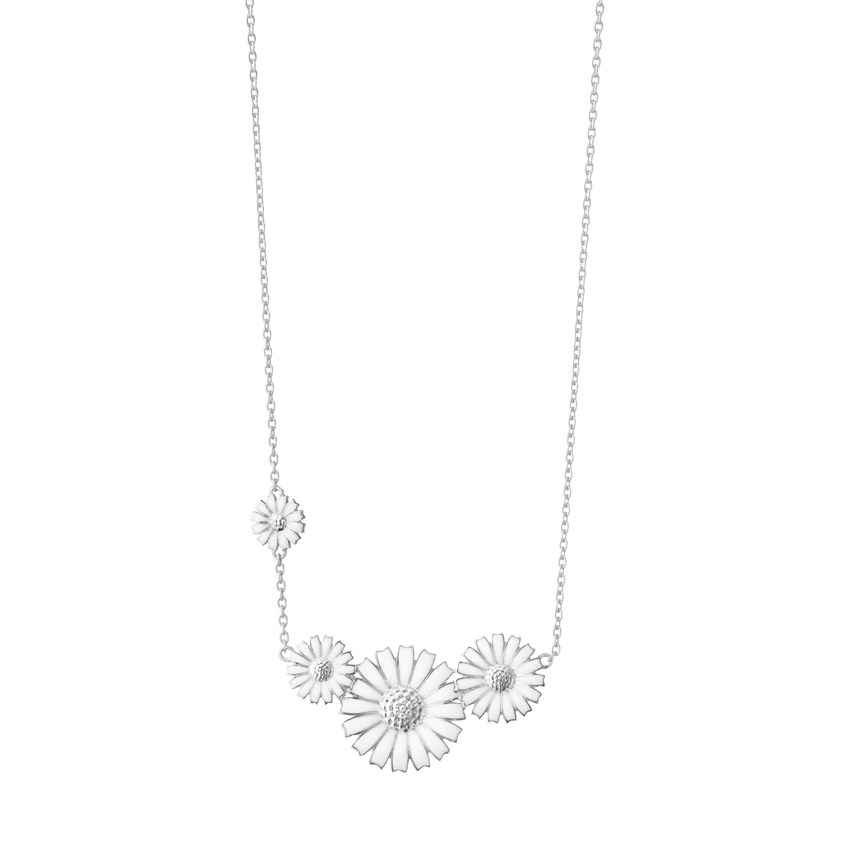 Fyra vackra tusenskönor formar detta halsband i 925 Sterling silver som hyllar Georg Jensens ikoniska Daisy-kollektion. Tusenskönorna är handmålade med emalj i en varm vit nyans.