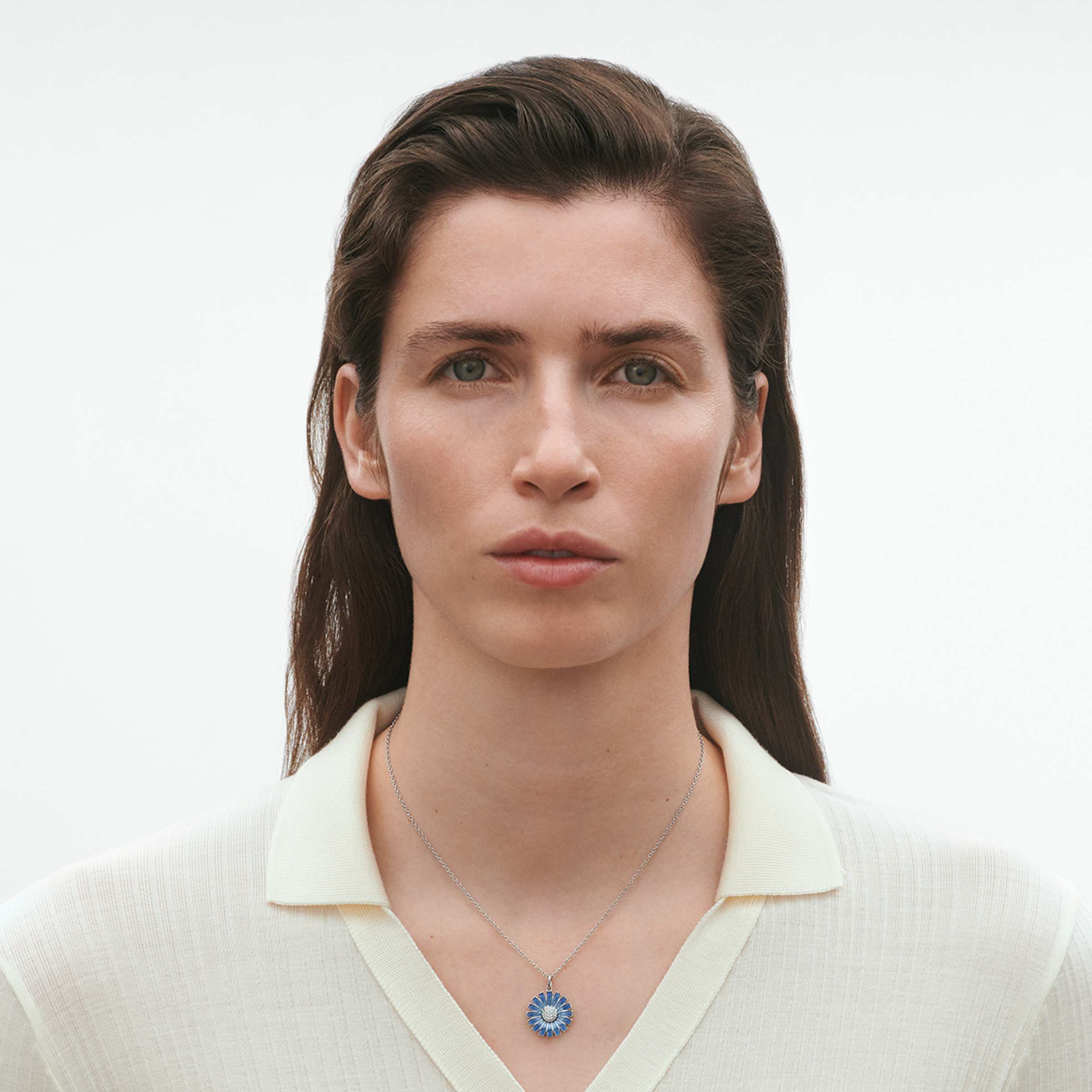 En blommande blå tusensköna, handmålad med emalj i en blå nyans, på en kedja i 925 Sterling silver.