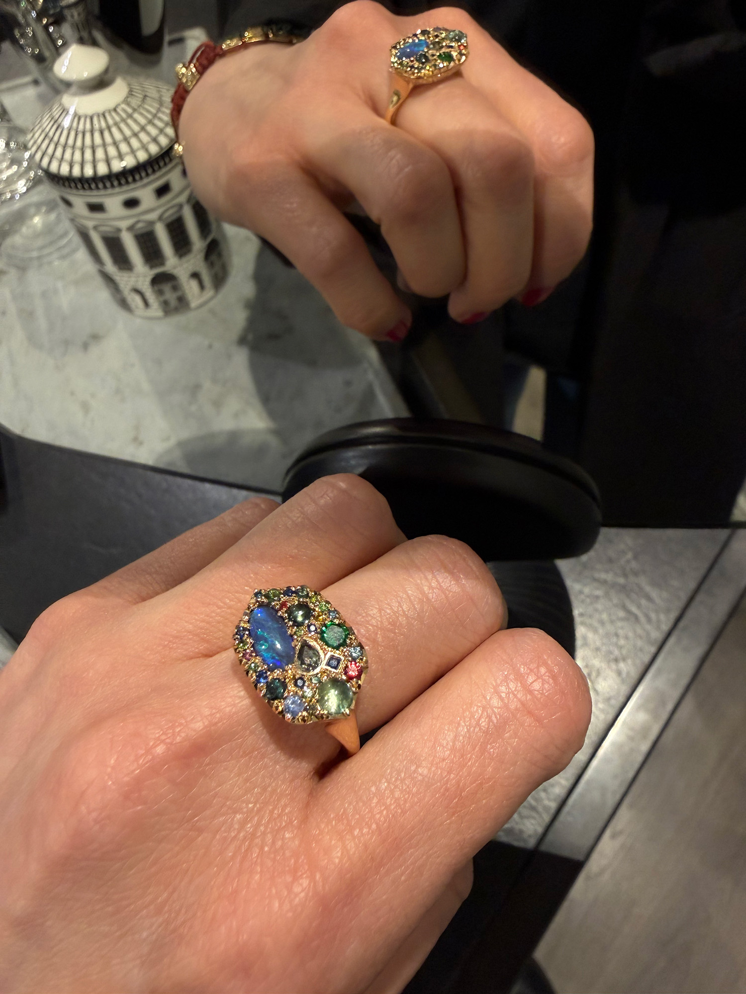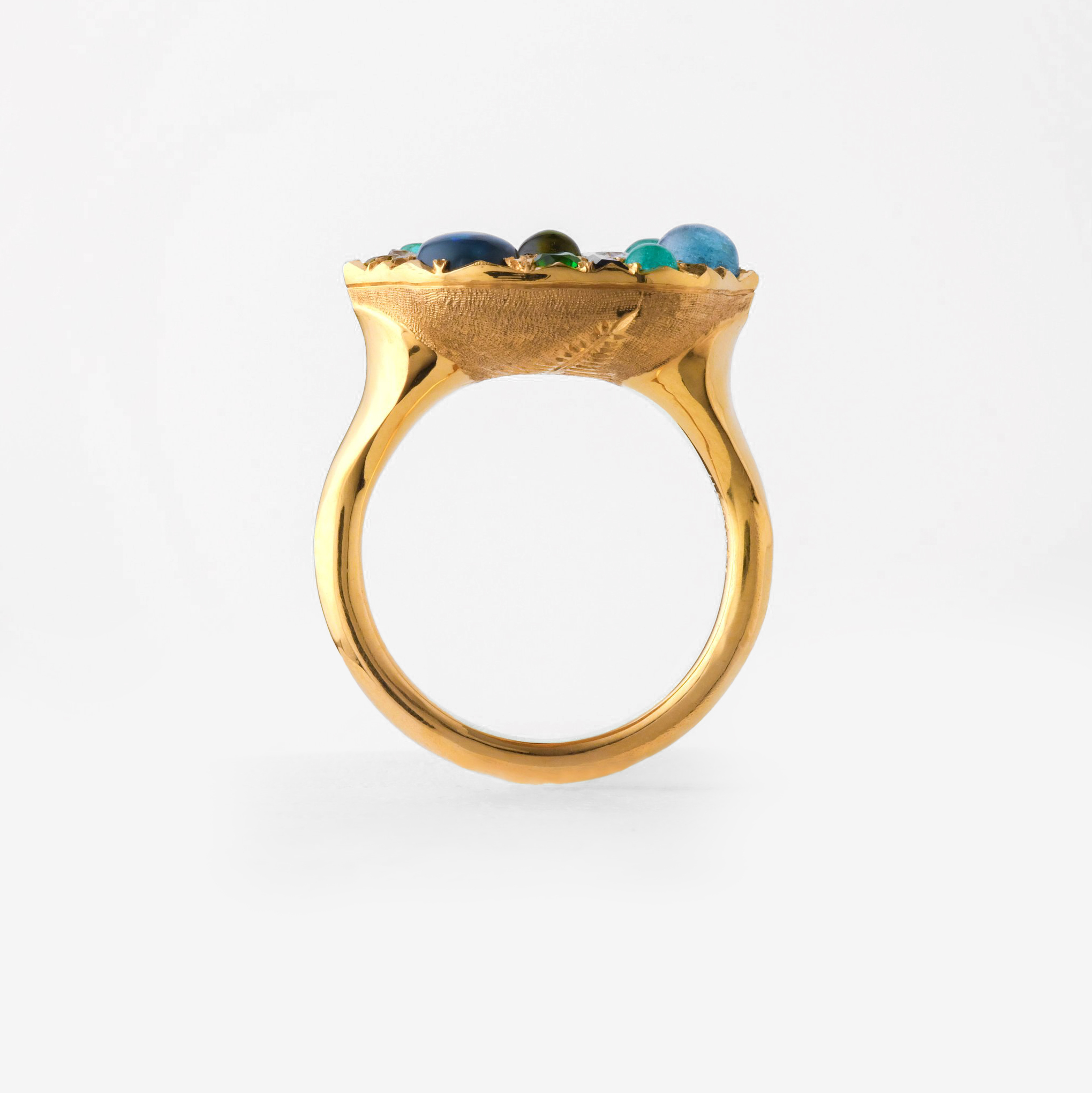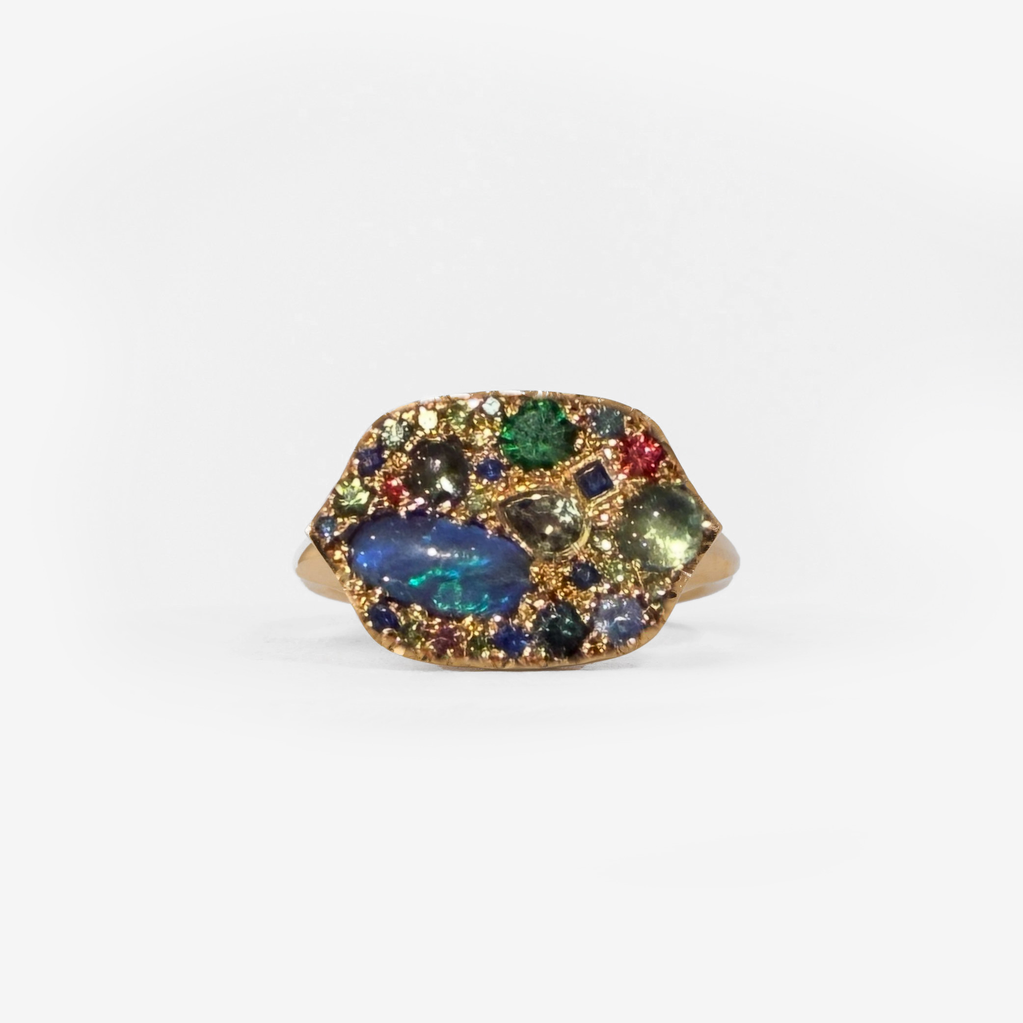 Ring i återvunnet 18k guld med safirer i olika färger, paraiba turmalin, grön turmalin, svart opal och antika diamanter.