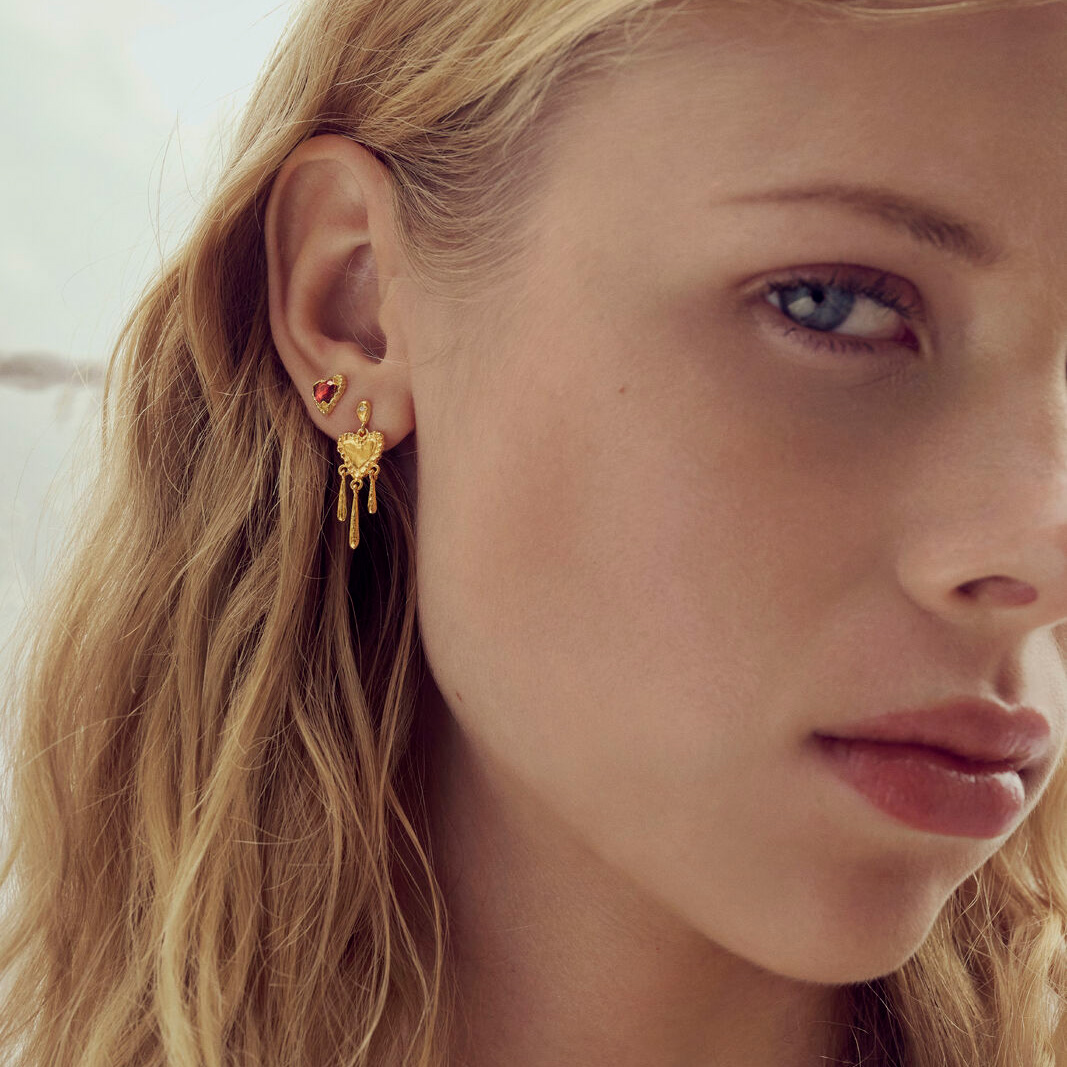 Låt de rosa granathjärtana tala för sig själva – en symbol för kärlek och omtanke. Tillverkade i återvunnet 925 Sterling silver och pläterade med 18k guld, med fokus på både skönhet och hållbarhet.