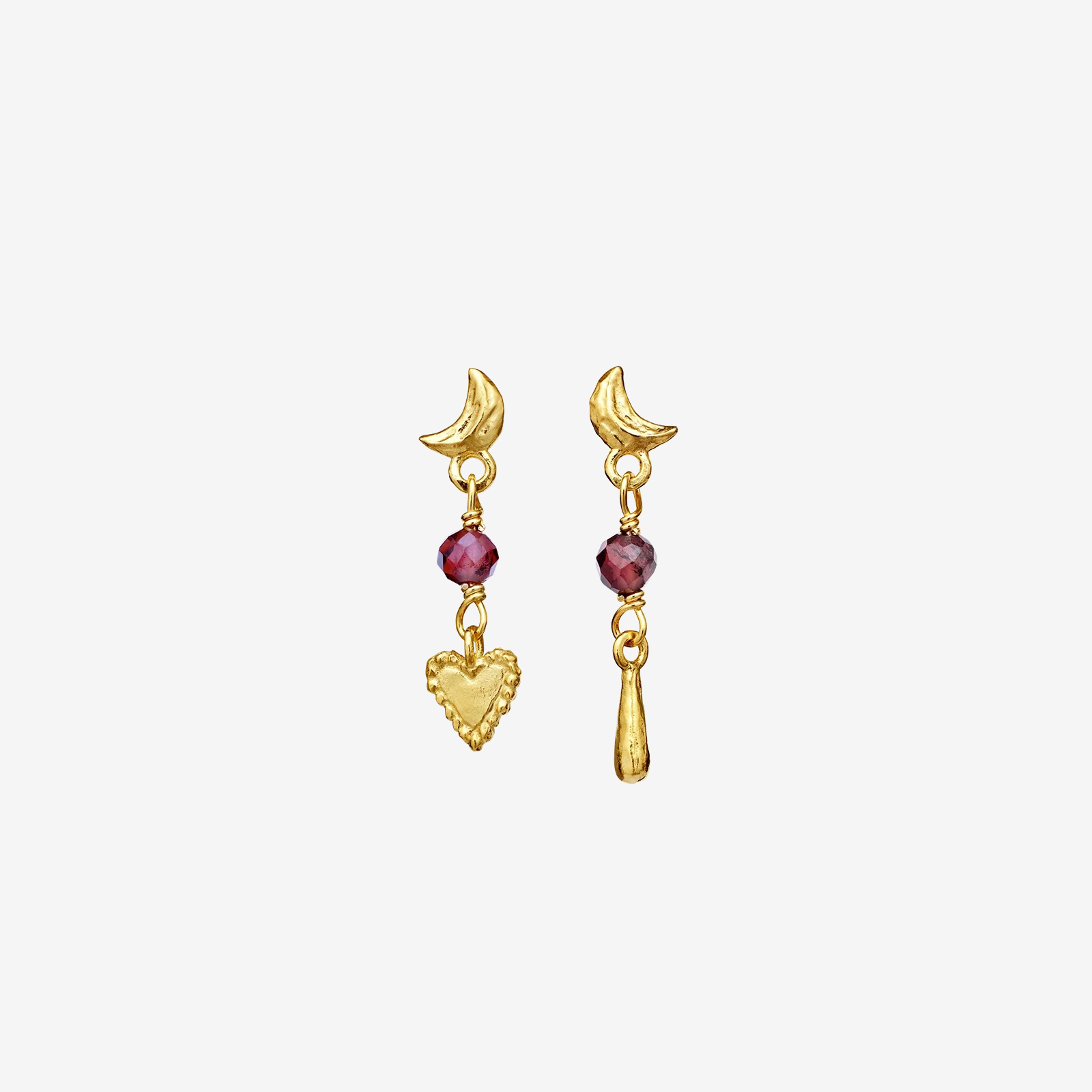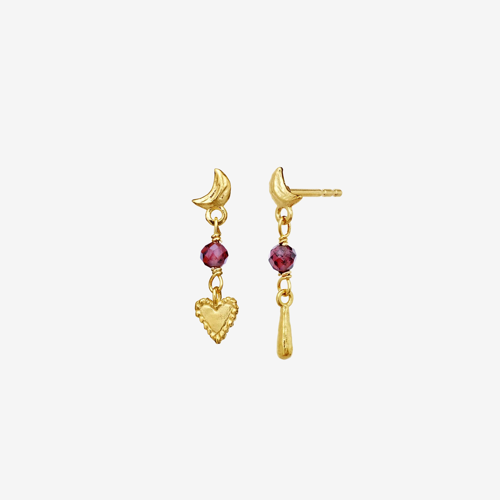 Nuova-örhängena i 18K guldpläterat, återvunnet 925 Sterling silver kombinerar halvmåneform med rosa granater, hjärtan och droppformade detaljer. En balanserad design med subtil symbolik – perfekt för dig som vill addera något unikt men bärbart till din smyckeskollektion.
