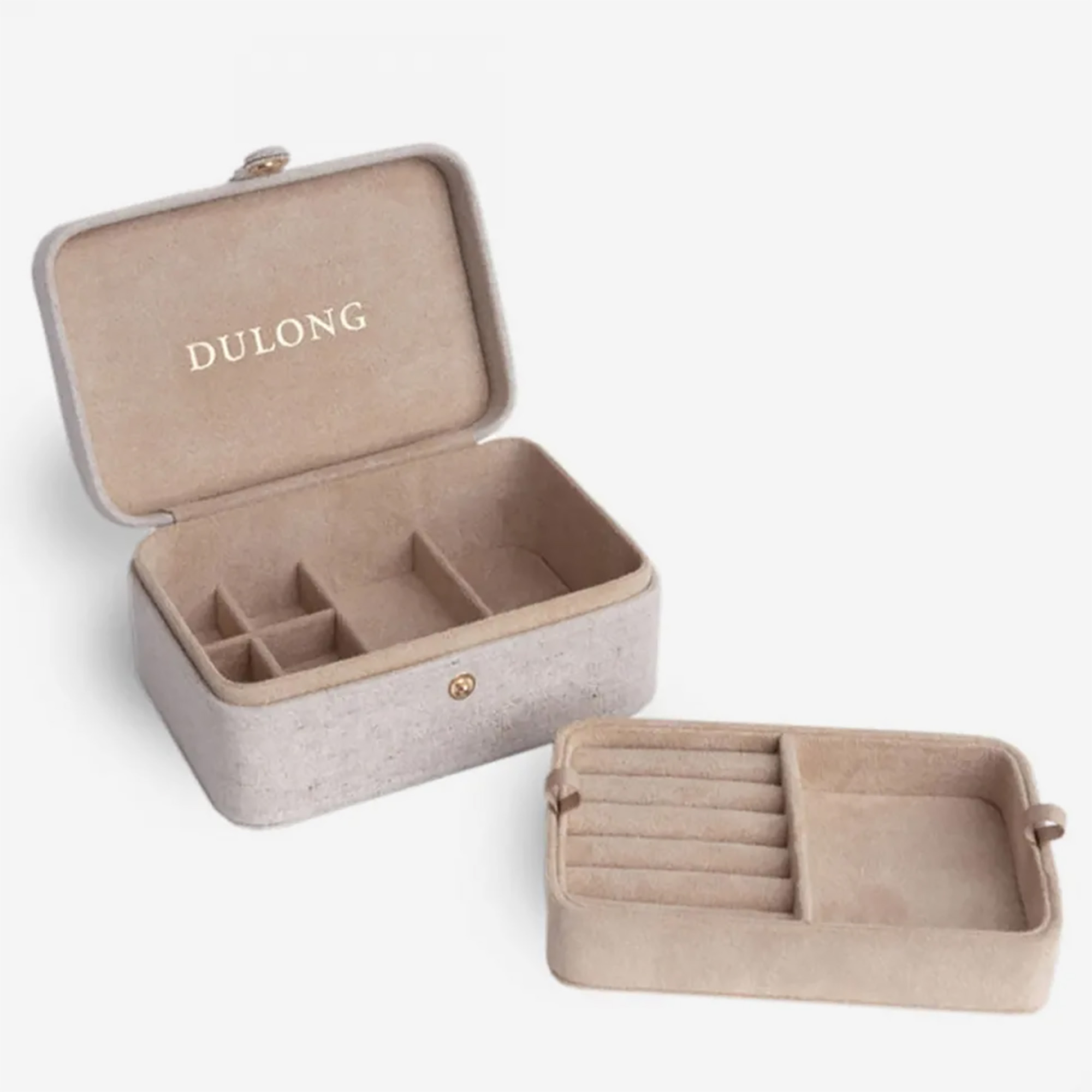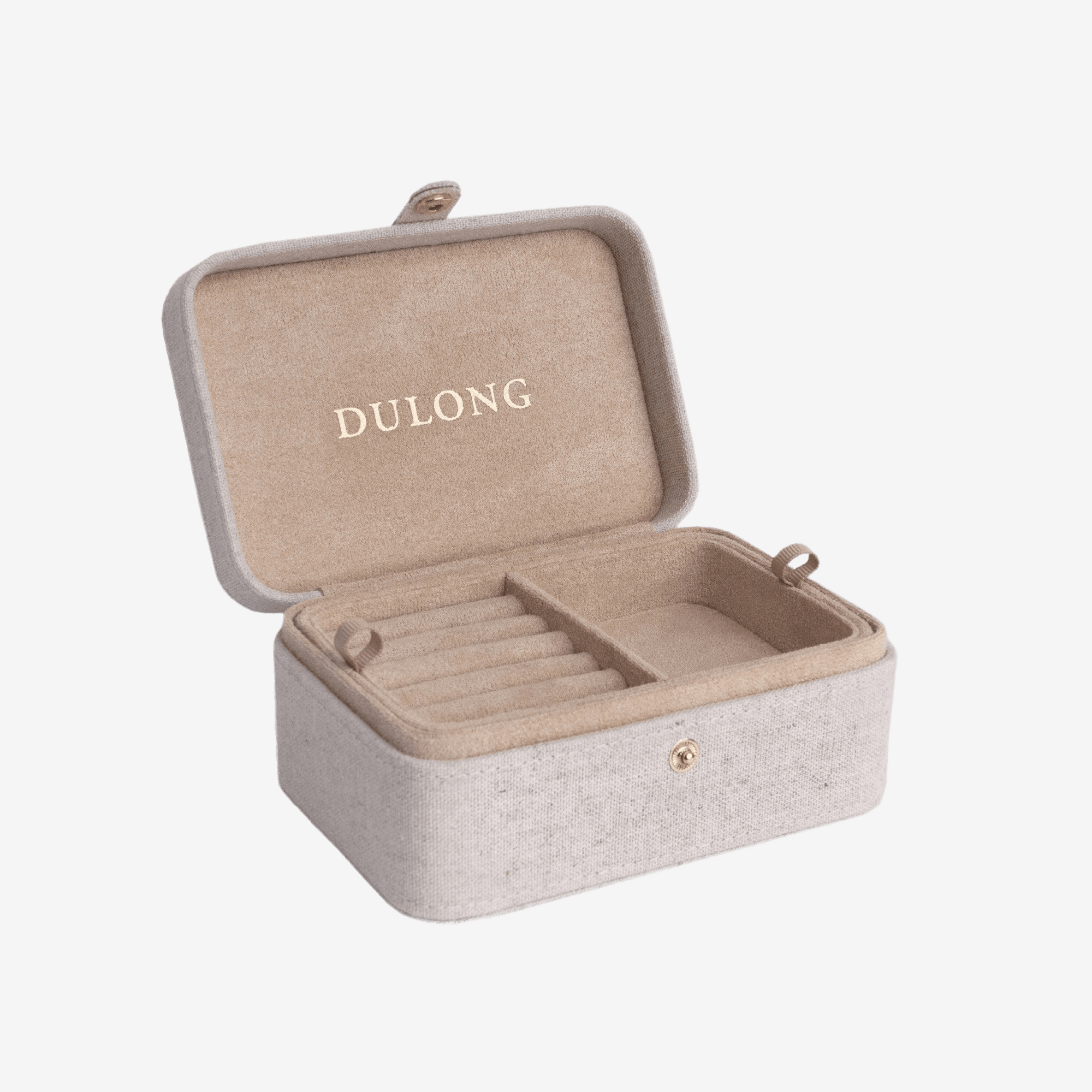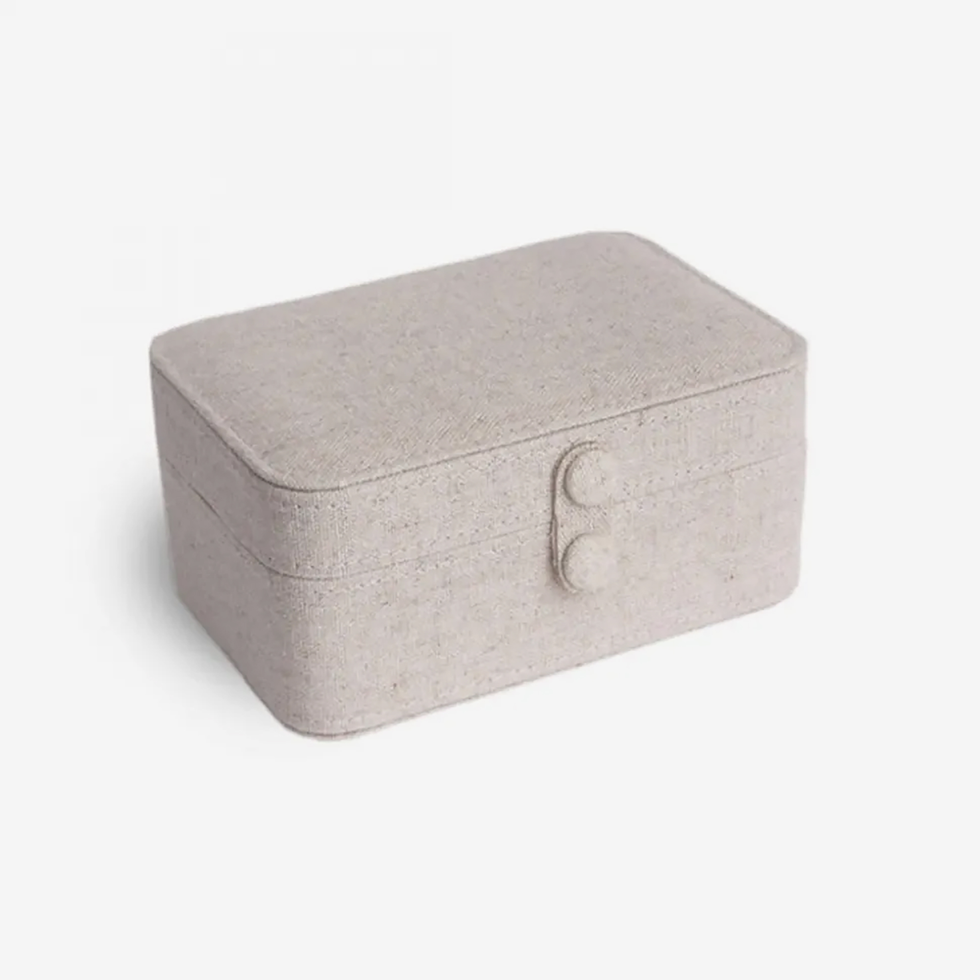 Ett praktiskt smyckeskrin i ljus linnefärg som skyddar och organiserar dina smycken på resan. Stängs med tygklädd tryckknapp för säkerhet och enkel öppning.