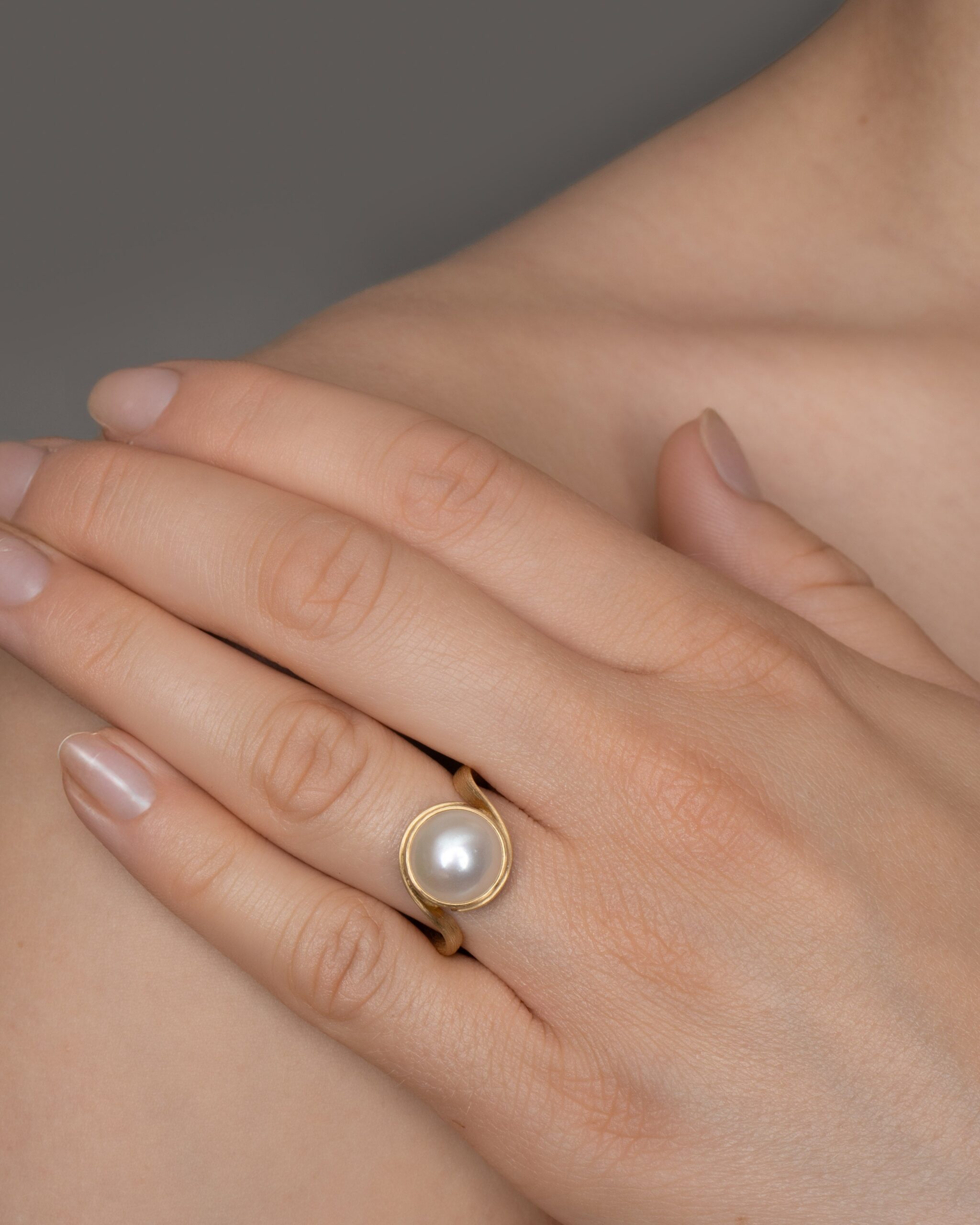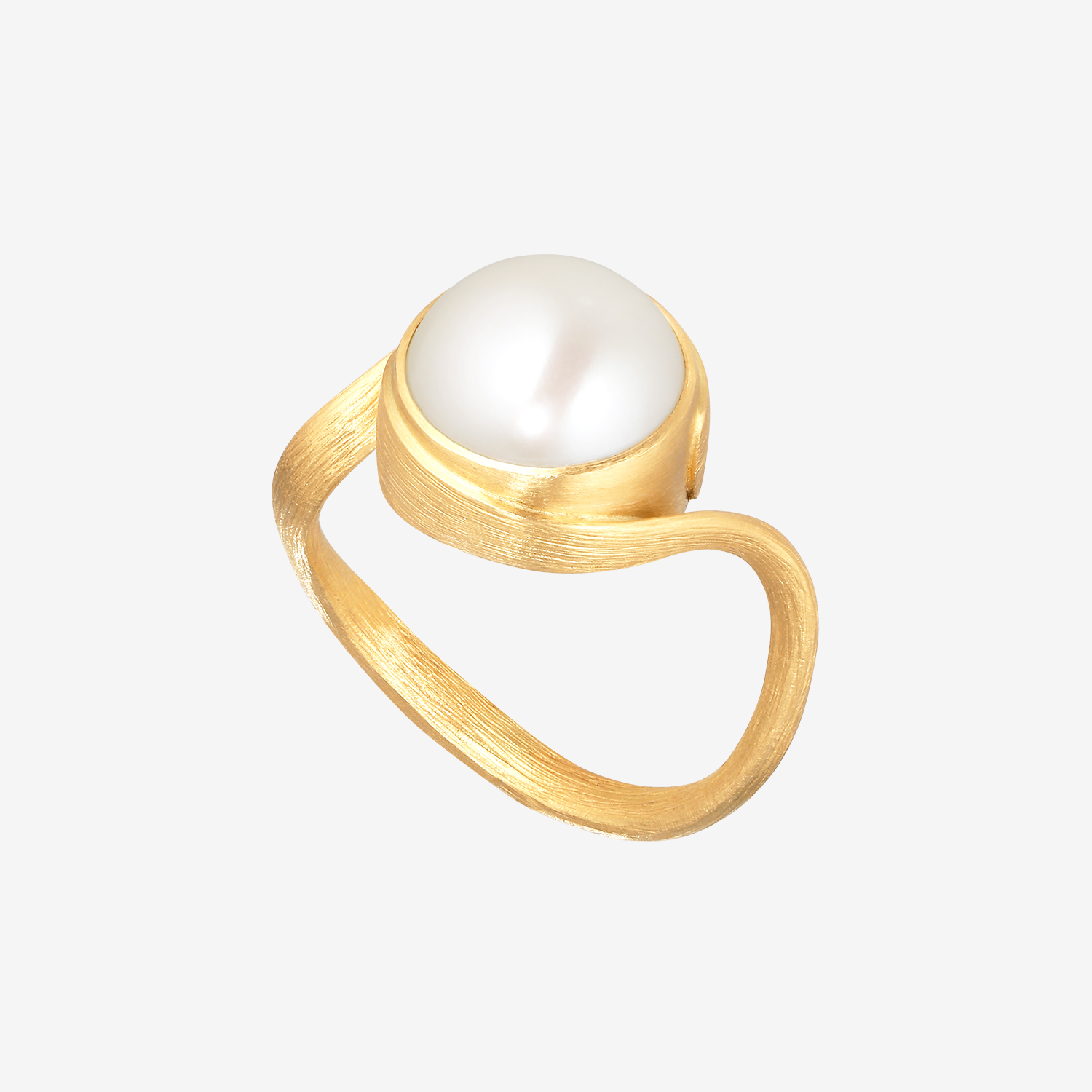 Handgjord ring i 18k guld med sötvattenspärla och Dulongs karakteristiska satinerade yta.